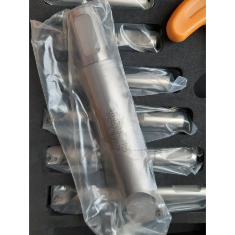 Набір для чистового розточування BT50-NBH2084 містить 8 шт. розточувальних різців SBJ (без пластин), мікрометричну розточувальну головку NBH2084, патрон BT50, набір ключів та ящик. Діаметр хвостовиків різців 20 мм. Точність системи 0,01 мм. Пластини, що використовуються у розточувальних різцях SBJ: TBGT0601, TPGH0902, TPGX0902, TPGH1103, TPGX1103 у комплект не входять.